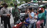 Personel TNI dan Polri menghentikan pengendara sepeda motor yang tidak menggunakan masker saat beraktivitas di Medan, Sumatera Utara, Rabu (6/5/2020). Pemerintah Kota Medan gencar menerapkan Peraturan Wali Kota Medan (Perwal) Nomor 11 Tahun 2020 tentang Karantina Kesehatan dengan memberikan sanksi hukuman penahanan KTP dan (FOTO : Antara/Septianda Perdana)