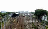 Tiang-tiang pancang untuk jaringan listrik untuk KRL relasi Yogyakarta-Solo terpasang di Kawasan Stasiun Lempuyangan, Yogyakarta, Kamis (7/5). KRL relasi Yogyakarta-Solo tersebut ditargetkan pada akhir tahun 2020 dapat beroperasi (FOTO : Wihdan Hidayat/ Republika)