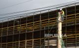 Pekerja memasang instalasi di tiang pancang untuk jaringan listrik untuk KRL relasi Yogyakarta-Solo di Kawasan Stasiun Tugu, Yogyakarta, Kamis (7/5). KRL relasi Yogyakarta-Solo tersebut ditargetkan pada akhir tahun 2020 dapat beroperasi (FOTO : Wihdan Hidayat/ Republika)