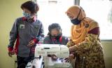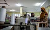 Pekerja korban PHK terdampak COVID-19 Elma Meika (20) (kiri) menyimak arahan instruktur saat mengikuti pelatihan menjahit di Balai Mulya Jaya, Jakarta, Kamis (7/5/2020). Balai Mulya Jaya Jakarta yang merupakan salah satu Unit Pelaksana Teknis (UPT) Kementerian Sosial, sejak 30 April 2020 telah menjadi Tempat Penampungan Sementara (TPS) dan pelatihan keterampilan bagi Pemerlu Pelayanan Kesejahteraan Sosial (PPKS) dan pekerja yang mengalami Pemutusan Hubungan Kerja (PHK) karena terdampak COVID-19. (FOTO : ANTARA /Aprillio Akbar)
