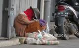 Pemulung beristirahat di trotoar salah satu ruas jalan di Kota Bandung, Kamis (7/5). Para pemulung merupakan salah satu yang terdampak pandemi Covid-19, sepinya aktivitas masyarakat saat diberlakukannya pembatasan sosial berdampak pada minimnya ketersediaan rongsokan yang biasa mereka cari (FOTO : Edi Yusuf/Republika)