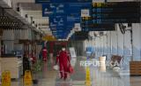 Warga berjalan di Bandara Halim Perdanakusuma yang sepi di Jakarta, Kamis (7/5/2020). Meski penerbangan domestik dengan ketentuan khusus mulai dibuka, Bandara Halim Perdanakusuma masih belum melayani penerbangan domestik (FOTO : ANTARA/ADITYA PRADANA PUTRA)