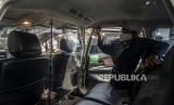 Pengemudi taksi daring, Aris Hardy Halim memasang plastik pembatas di dalam mobilnya di kawasan Bendungan Hilir, Jakarta, Jumat (8/5). Pemasangan plastik pembatas antara pengemudi dengan penumpang itu untuk mencegah penyebaran virus Corona (COVID-19) dan memberikan kenyamanan serta keamanan kepada penumpang taksi daring (FOTO : Republika/Putra M. Akbar)