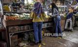 Warga berdiri di lantai yang telah dipasang stiker panduan jarak saat berbelanja di Pasar Atas Baru, Kota Cimahi, Jumat (8/5). Pihak pengelola pasar menerapkan konsep physical distancing untuk mengatur jarak dengan menempelkan stiker panduan jarak di area kios pedagang serta membatasi jumlah pengunjung menjadi 100 orang dengan waktu berbelanja sekitar 30 menit per sesi (FOTO : ABDAN SYAKURA/REPUBLIKA)
