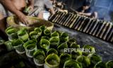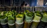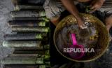 Pekerja memasukan nasi saat membuat lemang di Jalan Kramat Raya, Senen, Jakarta, Jumat (8/5). Lemang yang merupakan salah satu makanan favorit pada bulan Ramadhan khas Minang itu mengalami penurunan permintaan hingga 50 persen dan hanya membuat 150 hingga 200 pesanan setiap harinya karena penerapan PSBB di Jakarta (FOTO : Republika/Putra M. Akbar)