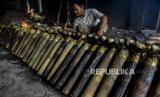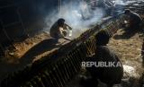 Pekerja membuat lemang di Jalan Kramat Raya, Senen, Jakarta, Jumat (8/5). Lemang yang merupakan salah satu makanan favorit pada bulan Ramadhan khas Minang itu mengalami penurunan permintaan hingga 50 persen dan hanya membuat 150 hingga 200 pesanan setiap harinya karena penerapan PSBB di Jakarta (FOTO : Republika/Putra M. Akbar)