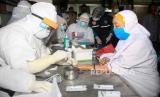 REPUBLIKA.CO.ID, SIDOARJO -- Petugas kesehatan melakukan tes diagnostik cepat atau rapid test COVID-19 kepada sejumlah jamaah di kawasan Masjid Besar Nurul Huda, Waru, Sidoarjo, Jawa Timur, Jumat (8/5/2020).