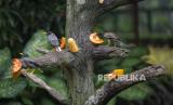 Burung-burung jalak belong koleksi Taman Burung memakan pakannya di Taman Mini Indonesia Indah (TMII), Jakarta, Sabtu (9/5/2020). Akibat ditutupnya TMII selama pandemi COVID-19, pengelola mengalami kesulitan penyediaan pakan untuk satwa-satwa koleksi sehingga mereka membuka donasi dengan target Rp180 juta untuk persediaan pakan Juni-Juli 2020 (FOTO : Antara/Aditya Pradana Putra)