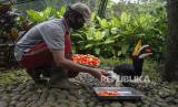 Petugas memberi pakan kepada burung rangkong badak (Rhinoceros hornbill) koleksi Taman Burung di Taman Mini Indonesia Indah (TMII), Jakarta, Sabtu (9/5/2020). Akibat ditutupnya TMII selama pandemi COVID-19, pengelola mengalami kesulitan penyediaan pakan untuk satwa-satwa koleksi sehingga mereka membuka donasi dengan target Rp180 juta untuk persediaan pakan Juni-Juli 2020 (FOTO : Antara/Aditya Pradana Putra)