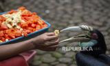 Petugas memberi pakan untuk burung julang koleksi Taman Burung di Taman Mini Indonesia Indah (TMII), Jakarta, Sabtu (9/5/2020). Akibat ditutupnya TMII selama pandemi COVID-19, pengelola mengalami kesulitan penyediaan pakan untuk satwa-satwa koleksi sehingga mereka membuka donasi dengan target Rp180 juta untuk persediaan pakan Juni-Juli 2020 (FOTO : Antara/Aditya Pradana Putra)
