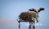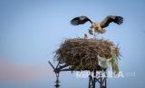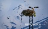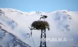 REPUBLIKA.CO.ID, VAN -- Seekor bangau membawa ranting untuk membuat sarang di tiang lampu di Provinsi Van, Turki pada 5 Mei 2020. Burung bangau tiba di Provinsi Van pada musim semi setelah migrasi musim dingin dan mulai membuat sarang mereka.