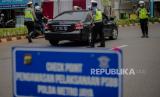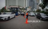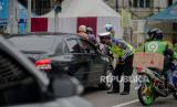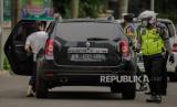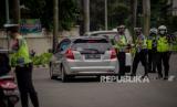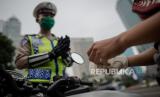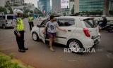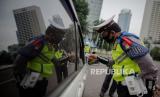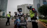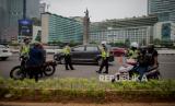 Petugas gabungan dari Kepolisian Polda Metro Jaya dan Dinas Perhubungan Pemprov DKI Jakarta melakukan penindakan pelanggaran Pembatasan Sosial Berskala Besar (PSBB) di kawasan Bundaran HI, Jakarta, Sabtu (9/5). Wakil Gubernur DKI Jakarta Ahmad Riza Patria memberi sinyal akan memperpanjang masa PSBB di Jakarta, mengingat masyarakat akan merayakan Hari Raya Idul Fitri dengan takbiran dan acara lainnya di tengah pandemi virus COVID-19 (FOTO : Republika/Thoudy Badai)