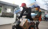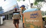 Warga membawa paket bahan pokok Idul Fitri usai dibagikan Bank Mandiri, Jakarta, Ahad (10/5) (FOTO : Tahta Aidilla/ Republika)