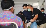Dirut Bank Mandiri Royke Tumilaar (kanan), Direktur Treasury, International Banking, & SAM Darmawan Junaidi (kedua kanan) menyerahkan bantuan bahan pokok Idul Fitri kepada anggota masyarakat terdampak Covid-19 di Jakarta, Ahad (10/5) (FOTO : Tahta Aidilla/ Republika)