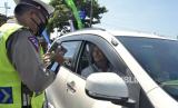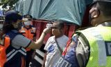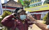 REPUBLIKA.CO.ID, DENPASAR -- Petugas memeriksa suhu tubuh pengendara yang memasuki wilayah Kota Denpasar, di Pos Pengamanan dan Penyekatan Uma Anyar, Denpasar, Bali, Senin (11/5/2020).