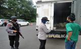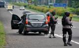 Petugas gabungan dari Polresta Bogor Kota, Dishub Kota Bogor dan Brimobda Jabar melakukan pemeriksaan kepatuhan penerapan Pembatasan Sosial Berskala Besar (PSBB) di pintu keluar gerbang tol Jagorawi, Kota Bogor, Jawa Barat, Senin (11/5/2020). Satlantas Polresta Bogor Kota mencatat sedikitnya 1 (FOTO : Antara/Arif Firmansyah)