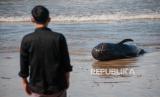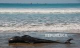 Menurut keterangan warga setempat paus pilot dengan panjang sekitar dua meter tersebut terseret ombak hingga akhirnya terdampar di bibir pantai dan mati sejak sejak Senin (11/5) dini hari.