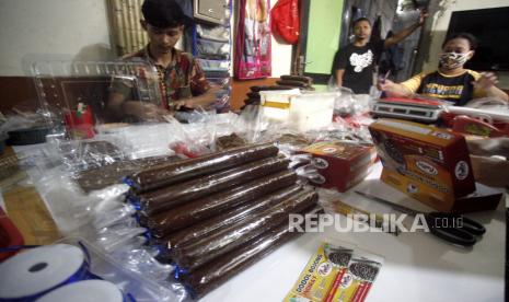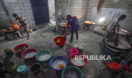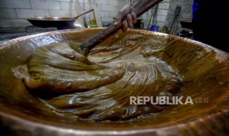 REPUBLIKA.CO.ID, TANGSEL -- Pekerja mengaduk adonan dodol Betawi di pusat pembuatan dodol di kawasan Cilenggang, Serpong, Tangerang Selatan, Banten, Selasa (12/5/2020). Menjelang Idu Ffitri permintaan dodol Betawi yang dijual seharga Rp57 ribu per kilogram itu untuk tahun ini mengalami penurunan permintaan imbas dari pandemi COVID-19. ANTARA FOTO/Muhammad Iqbal/foc.