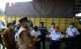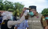 Plt Gubernur Aceh, Nova Iriansyah (kanan) menjalani pemeriksaan suhu badan oleh petugas karantina pelabuhan saat melakukan peninjauan pengapalan logistik dengan KMP BRR Aceh di Pelabuhan Penyeberangan Ulee Lheue, Banda Aceh, Aceh, Selasa (12/5/2020). Pemerintah mengeluarkan kebijakan bersama yang berlaku tanggal 5 hingga 31 Mei 2020 tentang layanan penyeberangan KMP BRR Aceh hanya untuk mengangkut logistik kebutuhan warga Pulau Sabang, Aceh, sedangkan penumpang orang wajib izin dari Gugus Tugas COVID-19 dengan tetap mematuhi protokol kesehatan guna mencegah penyebaran COVID-19 (FOTO : Antara/Ampelsa)