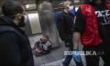 Tuna Wisma di sebuah stasiun subway di New York membuka paket makanan yang dibagikan relawan Muslims Giving Back. (FOTO : AP Photo/Wong Maye-E)