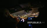 Mohamed Bahe, 36 director of the Muslim Community Center, left, drives with other volunteers towards an illuminated Brooklyn Bridge and New York City skyline on the way to Herald Square in Manhattan on Monday, April 27, 2020. They hand out food to the hungry, as part of their Need2Feed project which will have them giving out food every night for the month of Ramadan, in New York. (FOTO : AP Photo/Wong Maye-E)