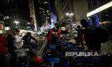 Relawan Muslims Giving membagikan makanan hangat kepada warga yang ada di Herald Square, New York. Makanan tersebut berasal dari donatur temasuk restoran makanan halal yang dimiliki relawan. (FOTO : AP Photo/Wong Maye-E)