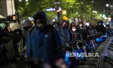 Antrean warga setempat menanti pembagian makanan hangat yang dibagikan relawan Muslims Giving di Herald Square, New York. Makanan tersebut berasal dari donatur temasuk restoran makanan halal yang dimiliki relawan. (FOTO : AP Photo/Wong Maye-E)
