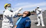 Petugas medis dari Dinas Kesehatan Kota Bandung mengambil sampel lendir dari seorang petugas Dinas Perhubungan saat tes swab Covid-19 di Terminal Cicaheum, Kota Bandung, Rabu (13/5). Tes swab yang dilakukan kepada 100 peserta secara acak yang terdiri dari petugas kepolisian, TNI, Satpol PP, Dishub, tenaga kesehatan, pedagang, awak bus dan warga sekitar tersebut bertujuan untuk mendeteksi dan mencegah penyebaran covid-19 di kawasan tersebut (FOTO : ABDAN SYAKURA/REPUBLIKA)