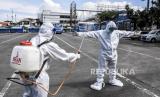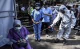 Petugas dari Dinas Kesehatan Kota Bandung menyemprotkan cairan disinfektan kepada seorang wartawan usai tes swab Covid-19 di Terminal Cicaheum, Kota Bandung, Rabu (13/5). Tes swab yang dilakukan kepada 100 peserta secara acak yang terdiri dari petugas kepolisian, TNI, Satpol PP, Dishub, tenaga kesehatan, pedagang, awak bus dan warga sekitar tersebut bertujuan untuk mendeteksi dan mencegah penyebaran covid-19 di kawasan tersebut (FOTO : ABDAN SYAKURA/REPUBLIKA)