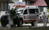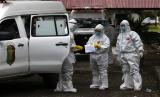 Petugas medis dari tim Satgas COVID-19 Kabupaten Simeulue yang membawa dua pasien terkonfirmasi positif menggunakan alat pelindung diri (APD) lengkap saat tiba di RSU Zainal Abidin, Banda Aceh, Aceh, Rabu (13/5/2020). Dua warga Simeulue yang memiliki riwayat penularan dari Jawa Barat terkonfirmasi positif COVID-19 berdasarkan hasil swab dirujuk ke RSU Zainal Abidin untuk mendapat perawatan. (FOTO : ANTARA /Irwansyah Putra)