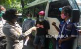 Polisi memeriksa sopir mikrobus yang mengangkut pemudik di Surabaya, Jawa Timur, Rabu (13/5/2020). Pemudik dengan jasa travel yang melanggar larangan mudik itu didata dan selanjutnya dipulangkan ke tempat asal sedangkan tujuh kendaraan mikrobus dari jasa travelnya dilakukan penindakan tilang (FOTO : Antara/Didik Suhartono)