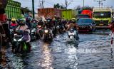 Kendaraan bermotor menembus jalan raya pantura Demak KM 8 ruas Demak-Semarang yang terendam limpasan air laut ke daratan (rob) di Demak, Jawa Tengah, Rabu (13/5/2020). Banjir rob yang melimpas ke jalur utama pantura Demak setinggi sekitar 15-40 sentimeter itu menyebabkan kemacetan lalu lintas sepanjang sekitar 7,5 kilometer dari arah Kabupaten Demak menuju Kota Semarang dan sepanjang sekitar satu kilometer dari arah Kota Semarang menuju Kabupaten Demak (FOTO : Antara/Aji Styawan)
