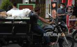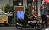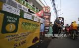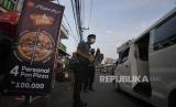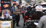 REPUBLIKA.CO.ID, TANGERANG SELATAN -- Karyawan salah satu gerai pizza menawarkan produk kepada warga yang melintas di Pondok Betung, Tangerang Selatan, Banten, Rabu (13/5/2020).