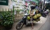 Pengantar gas elpiji mengambil kebutuhan pokok yang digantung di Tiang Berbagi Sedekah di Masjid Mujahidin, Ciragil, Jakarta, Kamis (14/5). Tiang berbagi sedekah yang berisi berbagai kebutuhan pokok ini merupakan wujud peduli dan berbagi antar sesama sekaligus bentuk gotong royong warga di masa pandemi Covid-19 (FOTO : Prayogi/Republika)
