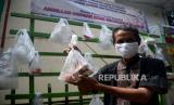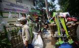 Pedagang perabotan mengambil kebutuhan pokok yang digantung di Tiang Berbagi Sedekah di Masjid Mujahidin, Ciragil, Jakarta, Kamis (14/5). Tiang berbagi sedekah yang berisi berbagai kebutuhan pokok ini merupakan wujud peduli dan berbagi antar sesama sekaligus bentuk gotong royong warga di masa pandemi Covid-19 (FOTO : Prayogi/Republika)
