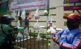 Pedagang kopi keliling dan Driver ojol mengambil kebutuhan pokok yang digantung di Tiang Berbagi Sedekah di Masjid Mujahidin, Ciragil, Jakarta, Kamis (14/5). Tiang berbagi sedekah yang berisi berbagai kebutuhan pokok ini merupakan wujud peduli dan berbagi antar sesama sekaligus bentuk gotong royong warga dimasa pandemi Covid-19 (FOTO : Prayogi/Republika)