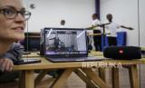 Direktur Artistik Balet Carolina Ann Brodie Mimi Worrell (di layar) mengajar melalui konferensi video kepada kelompok kecil siswa di Dance Center Kenya, Nairobi, Kenya, Rabu (22/4). Pandemi virus corona memaksa anak-anak untuk tinggal di rumah dan belajar dari jarak jauh tetapi di daerah kumuh Kenya, anak-anak menghadapi hambatan besar untuk pembelajaran jarak jauh (FOTO : AP / Brian Inganga)