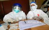 Dua petugas medis memeriksa hasil dari sejumlah alat test diagnostik cepat atau rapid test COVID-19 di Sungai Raya Dalam, Kabupaten Kubu Raya, Kalimantan Barat, Kamis (14/5/2020). Hingga Rabu (13/5/2020) kemarin dari hasil rapid test yang digelar Dinas Kesehatan Provinsi Kalbar di wilayah Kalbar tersebut terdapat 20 (FOTO : JESSICA HELENA WUYSANG/ANTARA FOTO)