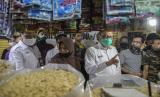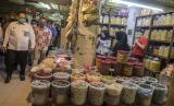 Dirut Perum Bulog Budi Waseso (kempat kanan) berbincang dengan pedagang ketika meninjau kestabilan harga gula di Pasar Jatinegara, Jakarta, Jumat (15/5/2020). Perum Bulog menggelar operasi pasar khusus gula guna menstabilkan harga secara serentak di seluruh Indonesia yang saat ini masih di atas harga eceran tertinggi atau HET pemerintah yakni Rp 12.500 per kilogram. (FOTO : ANTARA/Galih Pradipta)