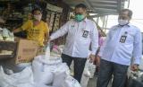 Dirut Perum Bulog Budi Waseso (kanan) berbincang dengan pedagang ketika meninjau kestabilan harga gula di Pasar Jatinegara, Jakarta, Jumat (15/5/2020). Perum Bulog menggelar operasi pasar khusus gula guna menstabilkan harga secara serentak di seluruh Indonesia yang saat ini masih di atas harga eceran tertinggi atau HET pemerintah yakni Rp 12.500 per kilogram. (FOTO : ANTARA/Galih Pradipta)