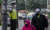Warga melintas di samping sebuah patung polisi lalu lintas yang dipasangkan masker di Bandung, Jawa barat, Jumat (15/5/2020). Patung yang menjadi salah satu simbol ketertiban berlalu lintas Kota Bandung tersebut dipasangkan masker guna meningkatkan kesadaran masyarakat untuk wajib menggunakan masker di masa pandemi COVID-19. (FOTO : ANTARA/Novrian Arbi)