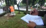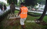 Seorang warga membersihkan sampah setelah dijatuhi hukuman sosial karena tidak mengenakan masker saat terjaring razia penindakan pelanggaran aturan Pembatasan Sosial Berskala Besar (PSBB) oleh Satpol PP di kawasan Kuningan, Jakarta, Jumat (15/5/2020). Pemprov DKI Jakarta memberlakukan sanksi sosial terhadap pelanggar PSBB dengan memakaikan rompi bertuliskan pelanggar PSBB sembari membersihkan fasilitas umum (FOTO : Antara/Indrianto Eko Suwarso )