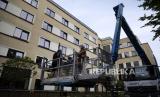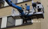 Terry Focant (kanan) menggunakan crane bersiap untuk mengunjungi saudaranya Bernadette Focant di lantai tiga rumahnya di Watermael-Boitsfort, Belgia, Sabyu (9/5). Tristan Van den Bosch, seorang operator crane, melihat peralatan crane menganggur karena pandemi virus corona dan banyak keluarga yang tidak dapat melihat lansia yang terkunci di rumah perawatan (FOTO : AP / Virginia Mayo)
