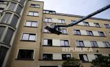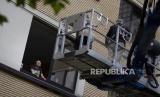 Suzanne Putseys (di jendela kiri) berbicara dengan keponakannya Eve Putseys di atas crane di luar jendelanya di Watermael-Boitsfort, Belgia, Sabtu (9/5). Tristan Van den Bosch, seorang operator crane, melihat peralatan crane menganggur karena pandemi virus corona dan banyak keluarga yang tidak dapat melihat lansia yang terkunci di rumah perawatan (FOTO : AP / Virginia Mayo)