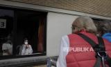 Bernadette Focant (kiri) dari jendela lantai tiga saat ia menerima kunjungan saudara perempuannya dengan crane di Watermael-Boitsfort, Belgia, Sabtu (9/5). Tristan Van den Bosch, seorang operator crane, melihat peralatan crane menganggur karena pandemi virus corona dan banyak keluarga yang tidak dapat melihat lansia yang terkunci di rumah perawatan (FOTO : AP / Virginia Mayo)