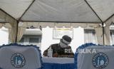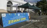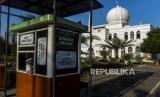 Petugas menunggu warga yang akan menyalurkan zakat fitrah di Masjid Agung Al-Azhar, Jakarta, Sabtu (16/5). Masjid Agung Al-Azhar membuka layanan pembayaran zakat fitrah melalui sistem drive thru selama pandemi virus Corona dengan memberlakukan protokol kesehatan dan keselamatan (FOTO : Republika/Putra M. Akbar)