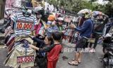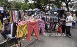 Calon pembeli memilih pakaian anak di salah satu lapak di Pasar Kaget di kawasan Monumen Perjuangan Rakyat, Jalan Japati, Kota Bandung, Ahad (17/5). Meski sudah diterapkan Pembatasan Sosial Berskala Besar (PSBB) Provinsi Jawa Barat sejak sepekan terakhir, namun menjelang lebaran pasar kaget mulai ramai dikunjungi warga yang ingin membeli kebutuhan pakaian dan perlengkapan lainnya untuk perayaan Idul Fitri 1441 H. (FOTO : ABDAN SYAKURA/REPUBLIKA)