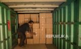 Relawan Gugus Tugas Percepatan Penanganan Covid-19 menata paket bantuan di Gor Senen, Jakarta, Senin (18/5). PT Adaro bersama Bakrie dan Brothers menyalurkan 30 ribu paket bantuan yang disalurkan melalui relawan Gugus Tugas Percepatan Penanganan Covid-19 untuk warga dari 13 kota dan kabupaten di Jabodetabek (FOTO : Republika/Thoudy Badai)