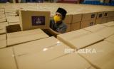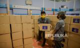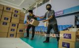 Relawan Gugus Tugas Percepatan Penanganan Covid-19 memempelkan stiker pada paket bantuan di Gor Senen, Jakarta, Senin (18/5). PT Adaro bersama Bakrie dan Brothers menyalurkan 30 ribu paket bantuan yang disalurkan melalui relawan Gugus Tugas Percepatan Penanganan Covid-19 untuk warga dari 13 kota dan kabupaten di Jabodetabek (FOTO : Republika/Thoudy Badai)