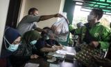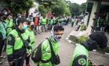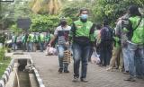 Pengemudi ojek daring antre untuk berbelanja kebutuhan pangan pesanan pelanggan di Pasar Mitra Tani Kementerian Pertanian di Pasar Minggu, Jakarta, Senin (18/5/2020). Badan Ketahanan Pangan Kementerian Pertanian mengadakan gelar pangan murah untuk komoditi pangan pokok stategis beberapa diantaranya meliputi gula pasir, bawang, daging dan beras serta dapat dibeli secara daring oleh konsumen guna mendukung imbauan pemerintah agar warga tetap beraktivitas dari rumah. (FOTO : ANTARA/Aprillio Akbar)